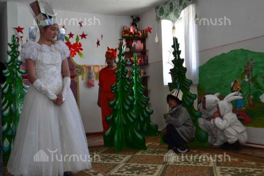 Ак-Талаа районундагы бөбөктөргө «Кар ханышасы» аттуу жомок жагымдуу маанай тартуулоодо (фото)