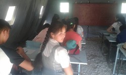 Ак-Кыядагы мектептин окуучулары чатырларда окуп жатышат