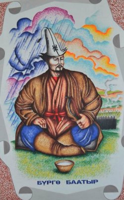 : Көмкөрүлгөн жыгач аяктын ичине боз үйдүн түндүгү аркылуу кар жаадырган ак-талаалык Бүргө баатырдын баяны